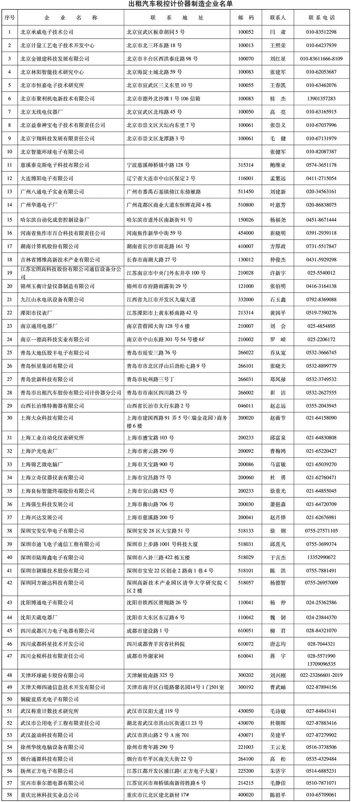 2.出租汽车税控计价器制造企业名单