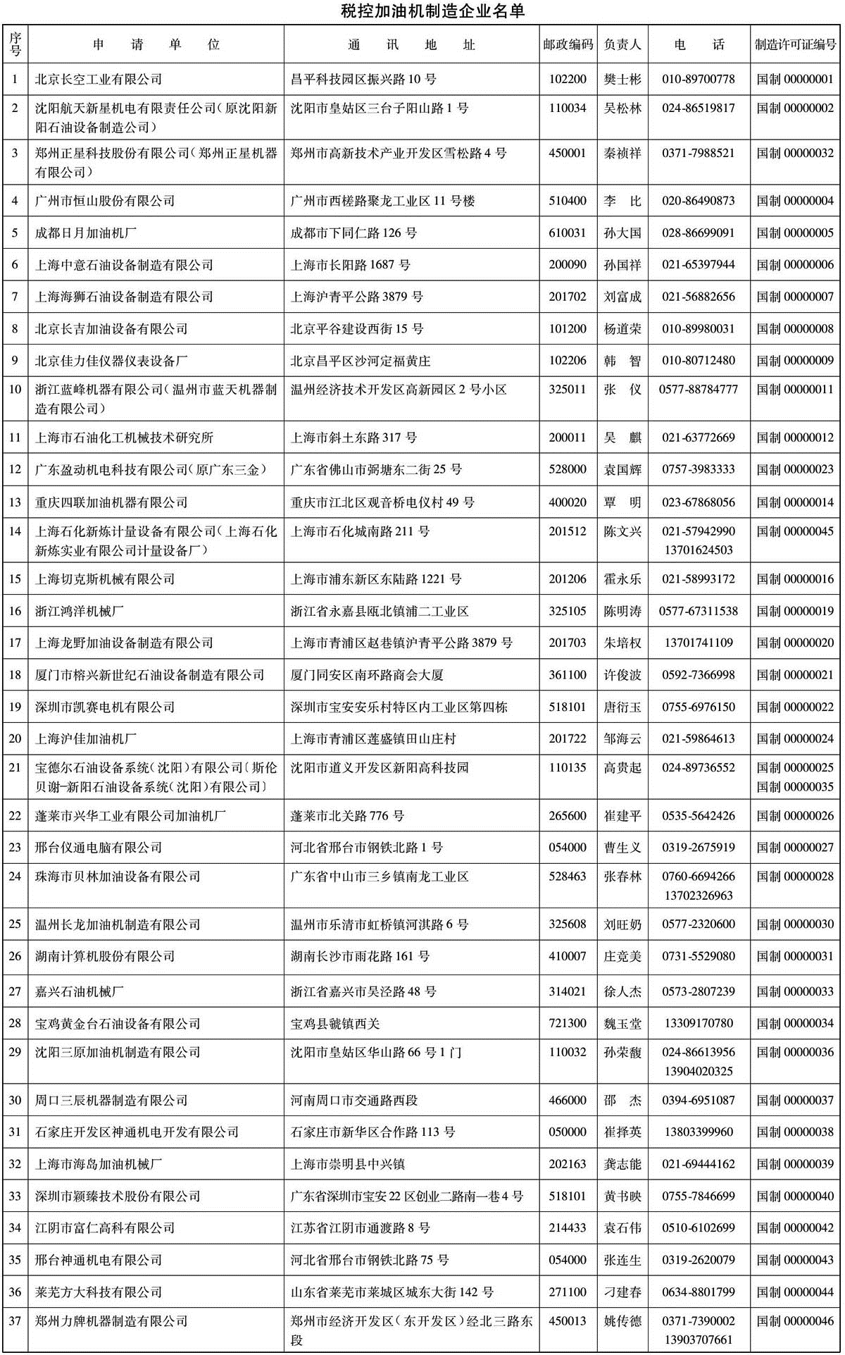 2.税控燃油加油机制造企业要于2004年6月底以前,到各省级质量技术监督局重新换发制造许可证,制造许可证的编号由各省按照质技监局量发〔1999〕108号文件规定的编号方法重新编号。此次换发的制造许可证的有效期从换证之日开始到原证书有效期止。