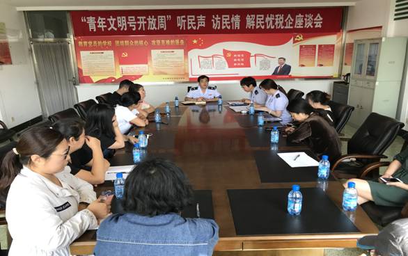 10户企业的法定代表人、财务负责人和办税人员,开展“听民声、访民情、解民忧”税企座谈活动。座谈会上,该局党委副书记刘卫军对青年文明号的基本情况作以介绍,并就该局办税服务厅日常纳税服务工作向纳税人征求意见和建议。纳税人代表踊跃发言,认真填写了办税服务情况调查问卷,对合并之后办税服务厅的新变化给予了充分肯定,并提出了宝贵意见。