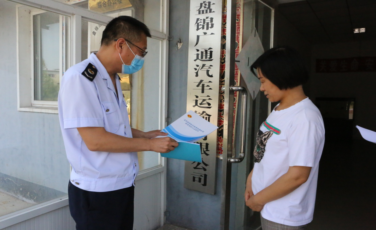 2020年8月,国家税务总局盘锦辽东湾新区税务局税源一股同志们走访了重点帮扶企业盘锦广通汽车运输有限公司。向企业发放了“税务帮扶”税费优惠政策指引汇编等宣传材料,并对疫情期间的税收优惠政策进行了详细讲解。