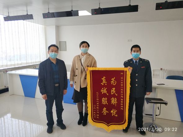 2021年3月30日一早,辽宁中驰汽贸有限公司工作人员手拿一面写着“为民解忧 真诚服务”的锦旗送到营口市税务局二分局车购税办税服务厅,并感慨道“多亏你们加班加点帮我们办理业务,要不公司的车现在还办不了登记手续,我要给你们高效率的服务点赞!”