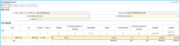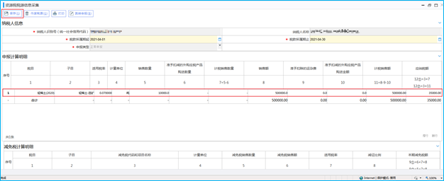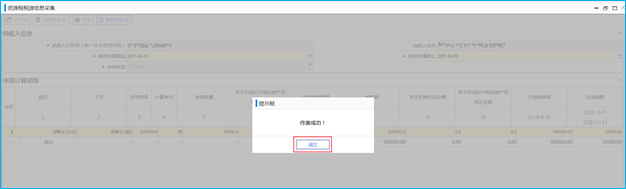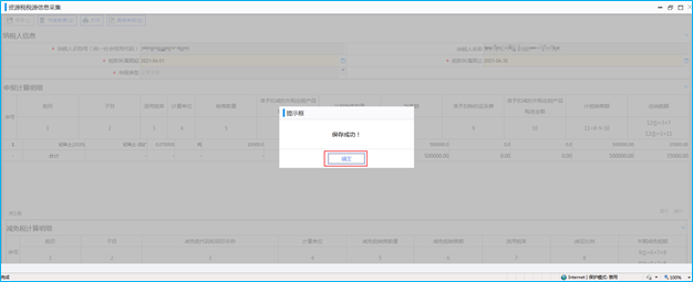 进入【资源税税源信息采集】后,选择税款所属期起止,系统自动带出已存在的资源税税种认定信息,在申报计算明细下如实填写“销售数量”“销售额”等信息,填写完成后点击“保存”,系统提示“保存成功”,资源税税源信息采集完成。
