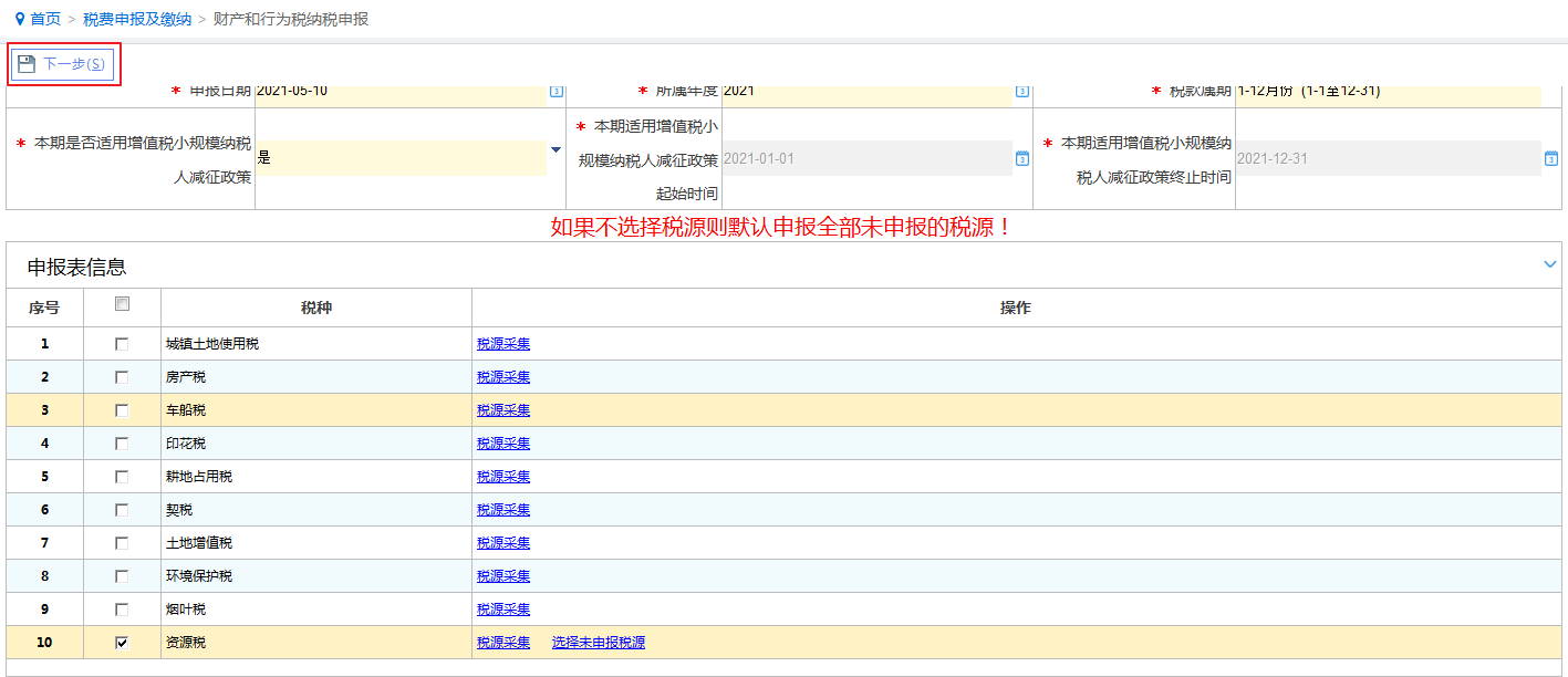 税源选择完成后,勾选需要申报的税种,点击“下一步”,系统跳转到申报信息确认界面。