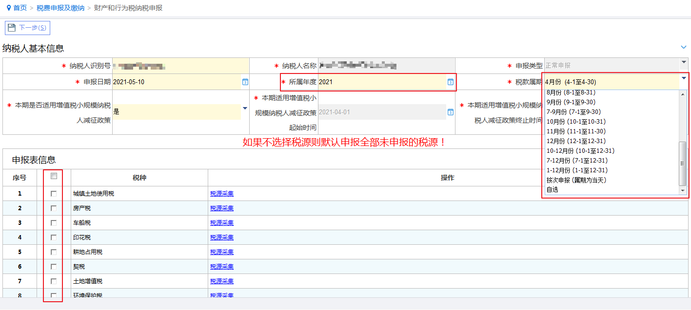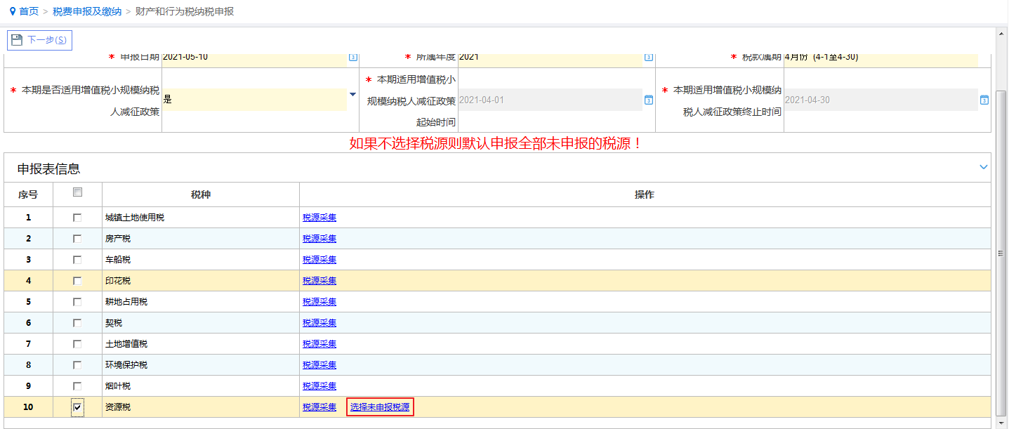 温馨提示:进行财产和行为税合并纳税申报需要存在税源信息,点击对应的“税种”后的“税源采集”跳转到相应的税源信息采集界面进行采集。具体税源采集操作详见下文。