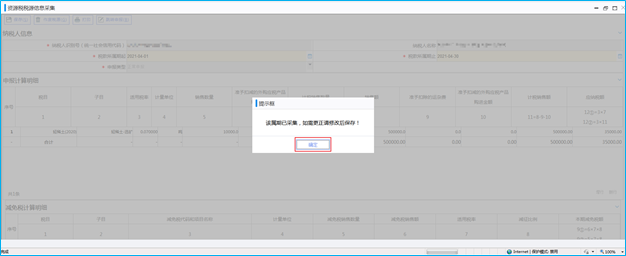 如果已经采集过资源税税源信息,进入资源税税源信息采集模块,系统将提示“该属期已采集,如需更正请修改后保存”,点击“确定”,系统则跳转到资源税税源信息采集模块。