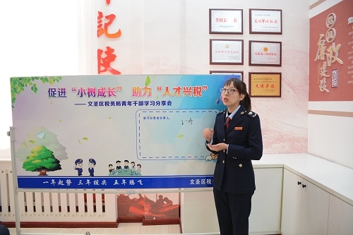 砥砺奋进,不负韶华。文圣区税务局将以此次青年干部学习分享会为新起点,继续拓展青年干部交流展示平台,以思想碰撞、学习互动激发青年干部学习热度、工作热情,努力打造出一批政治素质好、知识储备广、发展意识强的新时代税务铁军,忠实履行好新时代税务干部的职责使命。