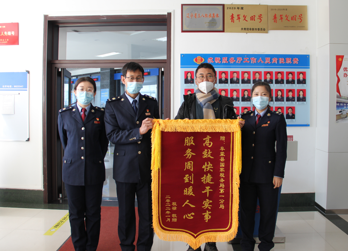 2022年1月19日一大早,国家税务总局阜新蒙古族自治县税务局刚刚开门,便迎来了一位满脸笑容、手执鲜红锦旗的纳税人。