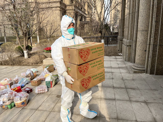 李勇负责这个小区里一栋居民楼近200户居民的物资采购和配送工作。8点开始,李勇不断往返于园区门口和居民家门口之间。太阳越来越大,防护服越来越闷,李勇感觉不停有汗水顺着脸颊往下淌,他想停下休息,可又想到很多居民都在盼着物资,脚步不自觉地更急了。