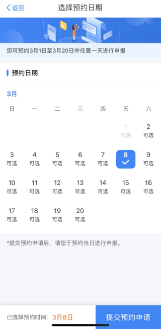 选择您希望申报的日期,点击“提交预约申请”完成预约