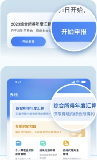 在预约当日,点击首页专题区域的“开始申报”按钮或“办&查”页中的“综合所得年度汇算”功能,开始申报。