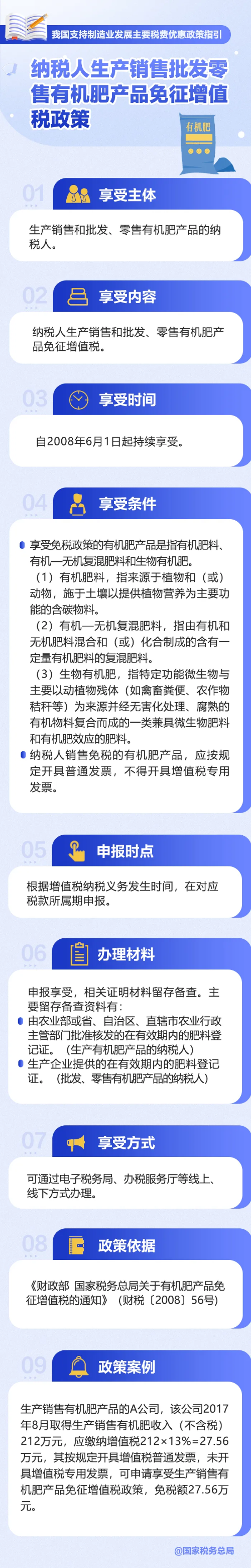 制造业是立国之本、强国之基,是实体经济的重要组成部分。中央经济工作会议指出,“落实好结构性减税降费政策,重点支持科技创新和制造业发展”。为使大家更加全面熟悉了解政策、更加高效准确适用政策,财政部、国家税务总局近日发布《我国支持制造业发展主要税费优惠政策指引》。今天带你了解:纳税人生产销售批发零售有机肥产品免征增值税政策↓