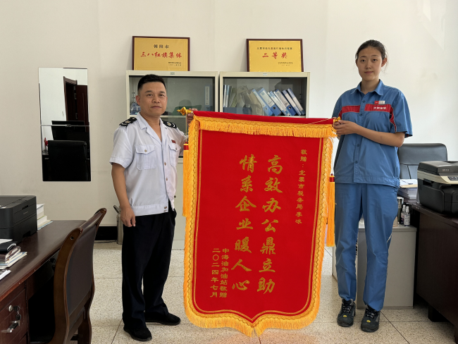 在春风化雨的服务中,国家税务总局北票市税务局办税服务厅再次谱写了为民解忧的温馨篇章。近日,中海油销售辽宁有限公司北票城关加油站负责人将一面印有“高效办公鼎立助 情系企业暖人心”的锦旗郑重地赠予了北票市办税服务厅的负责人、第一税务分局局长李冰同志手中,这不仅仅是一份荣誉,更是对税务人员情系企业、高效服务的最高赞誉。