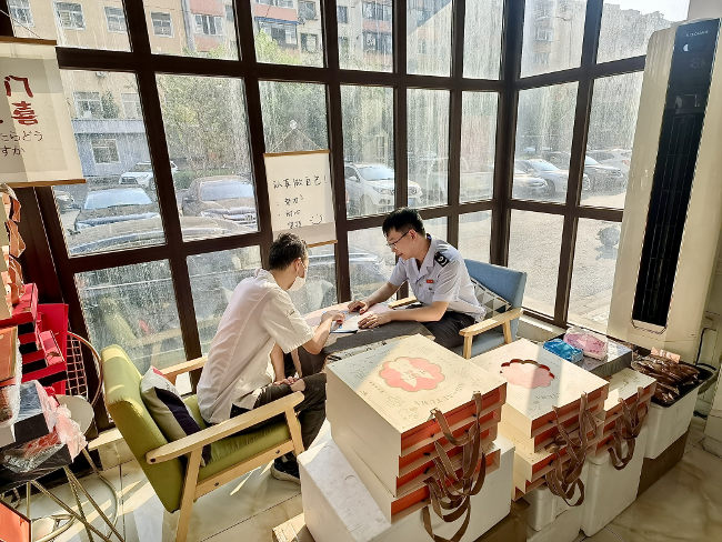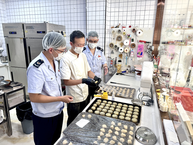 铁岭市银州区芝味芯爱甜点店生产的月饼外形精致、口味独特,深受年轻人喜爱,随着中秋佳节的临近,来购买月饼的客人络绎不绝。铁岭市银州区税务局税收宣传团队上门走访,针对店主提出的新电子税务局开具发票操作问题进行面对面辅导,了解生产经营情况,并送上个体工商户相关的税费优惠政策。税收宣传团队的成员还主动参与到月饼的制作过程中。