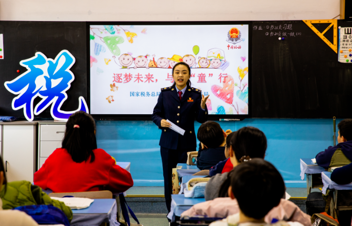 近日,国家税务总局鞍山市铁东区税务局走进鞍山市胜利小学,开展 “逐梦未来,与税‘童’行”主题税法宣传活动,课堂上税务干部精心准备了税收趣味动画,将抽象的税收知识转化为生动易懂的画面,让孩子们在轻松的氛围中学习、理解税收知识。图为税务干部正在与学生互动。
